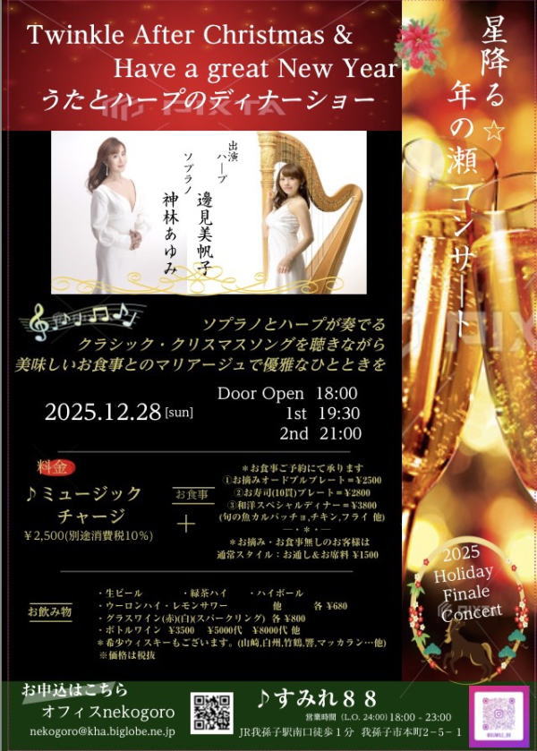 2025年12月28日(日)開場 18:00開演 1st 17:002nd 21:00場所:♪すみれ88 map料金ミュージックチャージ:2,500円(別途消費税10%)+お食事(ご予約にて承ります)お申し込みの際「ご意見・ご要望」にご記載ください。